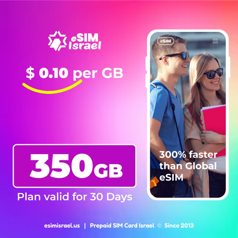 Cheapest eSIM Israel gives you a real Israeli 05X phone number, generous voice and SMS allowances, and 350GB prepaid data – all on fast 4G/5G networks. Activate for 30 days from your chosen start date and enjoy free incoming calls and SMS while you stay connected across Israel.